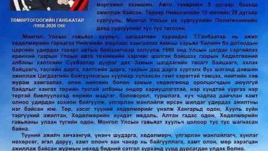 Хөвсгөл сумын унаган хүү, сумын ХҮНДЭТ ИРГЭН, тээврийн цагдаагийн албаны ахмад ажилтан, Монгол Улсын гавьяат хуульч, цагдаагийн хурандаа Төмөртогоогийн Ганбаатар нь 2026 оны 01 дүгээр сарын 07-ны өдөр өвчний улмаас таалал төгссөн нь нутгийн зон олон бид бүхэнд хүнд гарз тохиолоо. Таны нутгаа гэсэн сэтгэл, ажилч, хөдөлмөрч, үлгэрлэн манлайлагч, хүнлэг нөхөрсөг, эгэл даруу зан төрх нь нутгийн зон олон бидний сэтгэл, зүрхэнд үүрд мөнх үлдэх болно. Талийгаачийн ар гэр, төрөл төрөгсөд, ахан дүүсэд нь нутгийн зон олныхоо өмнөөс гүн эмгэнэл илэрхийлье. УМ САЙН АМГАЛАН БОЛТУГАЙ ИРГЭДИЙН ТӨЛӨӨЛӨГЧДИЙН ХУРАЛ ЗАСАГ ДАРГЫН ТАМГЫН ГАЗАР ХӨВСГӨЛ СУМЫН АРД, ИРГЭД