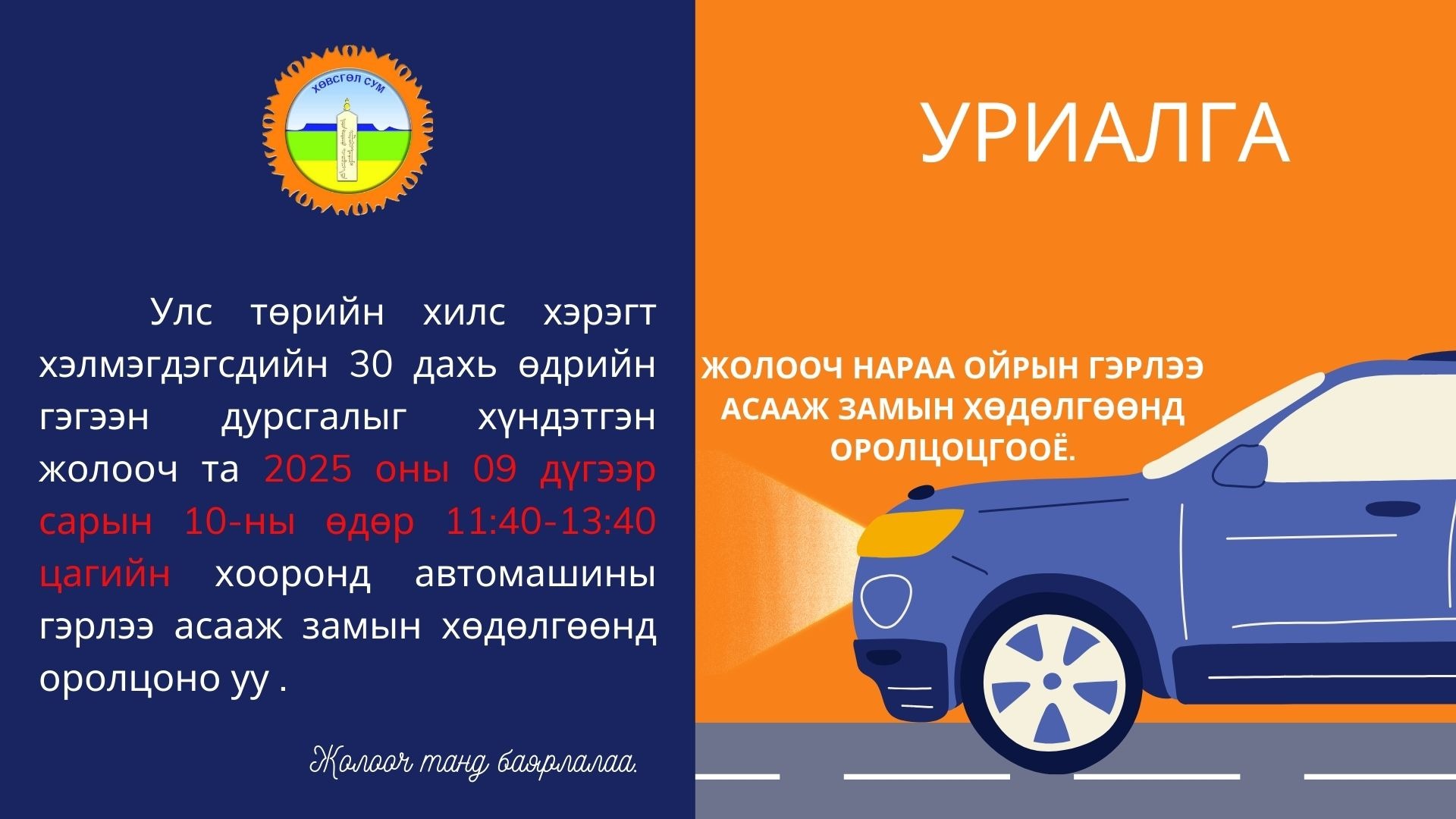 Улс төрийн хилс хэрэгт хэлмэгдэгсдийн 30 дахь өдрийн гэгээн дурсгалыг хүндэтгэн жолооч та 2025 оны 09 дүгээр сарын 10-ны өдөр 11:40-13:40 цагийн хооронд автомашины гэрлээ асааж замын хөдөлгөөнд оролцоно уу.